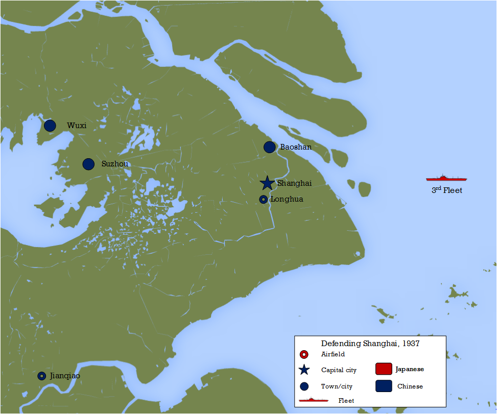 On the 16th Hosho and Ryujo planes struggled to get aloft due to remnants of typhoon, but nevertheless managed to damage or destroy dozens of planes on the ground at Shanghai’s various airfields. The Chinese again made efforts to sink the Izumo but again failed to land a hit, as the venerable old ship began to build a reputation for good luck (she would remain undamaged throughout the conflict). At this time, the fierce fighting on the ground began to subside as the Chinese forces failed to dislodge the small Japanese force, with carrier and seaplane bombers carrying out effective strikes to protect their comrades on the ground and sever lines of communication into the city. Chinese aircraft mounted several bombing raids that were generally ineffective and a number were shot down, as gradually a battle of attrition began to unfold that favoured the Japanese.